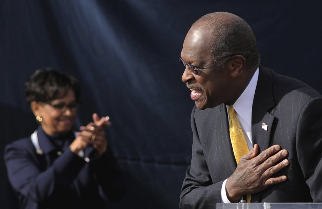 Republican presidential candidate Herman Cain delivers an announcement Saturday at a campaign event in Atlanta. “I am suspending my presidential campaign because of the continued distractions and the continued hurt caused on me and my family,” Cain told supporters gathered at what was to have become his national campaign headquarters. (AP Photo/David Tulis)