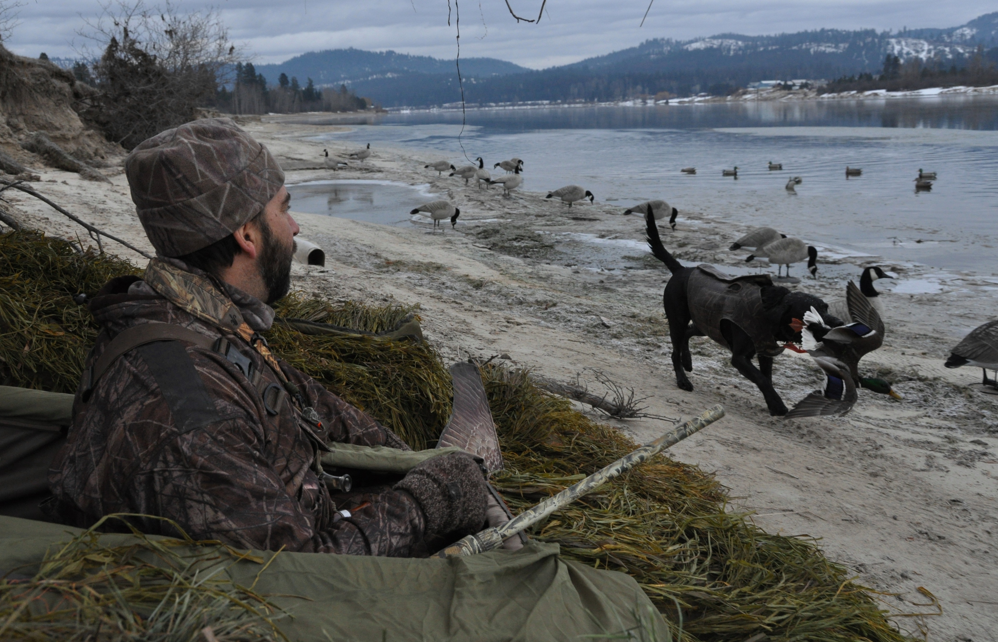 Temperatures in the teens didn’t even nick the the dog’s enthusiam for rounding up all the ducks and geese Kent Contreras could bring down from his Avery Outdoors layout blind.