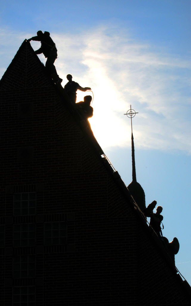A blue sky surrounds a roofing crew from Palmer Roofing as they cling to the steep pitch of the Trinity Lutheran Church in Lewiston Monday. (AP Photo/Lewiston Tribune, Kyle Mills)