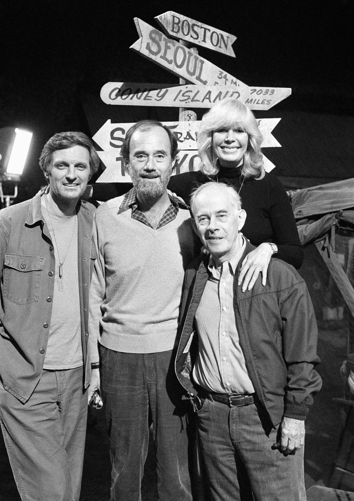 In this Dec. 23, 1982, photo, from left, Alan Alda , Burt Metcalfe , Harry Morgan and Loretta Swit (Maj. Margret stand on the set of M*A*S*H* in Los Angeles. The Emmy-winning character actor whose portrayal of the fatherly Col. Potter on television’s “M*A*S*H” highlighted a show business career that included nine other TV series, 50 films and the Broadway stage, died today. He was 96. More here. (AP file photo)