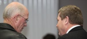 IDOG, Idahoans for Openness in Government, and co-sponsored by the Spokesman-Review and the Coeur d’Alene Press. Press Managing Editor Mike Patrick told the crowd it was the first time he could remember the two competing newspapers co-sponsoring an event. Among those attending were numerous local government officials and staffers, reporters for a variety of news media, political activists, several former state legislators and lots of interested citizens. Idaho Attorney General Lawrence Wasden singled out an audience member, former state Rep. Gary Ingram (left in photo, huddling with Wasden), for special recognition: Ingram is the author of much of the Idaho Open Meeting Law/