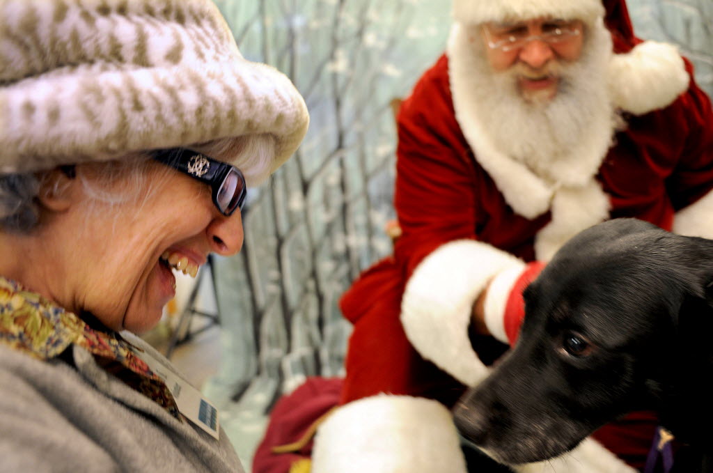“He’s acting shy,” said Fran Snavely about Templin, a lab mix during the Kootenai Humane Society pet portraits with Santa fund raiser at the Kootenai Humane Society Thrift Store today. Fran is a volunteer and Templin is available for adoption. (SR photo: Kathy Plonka)
