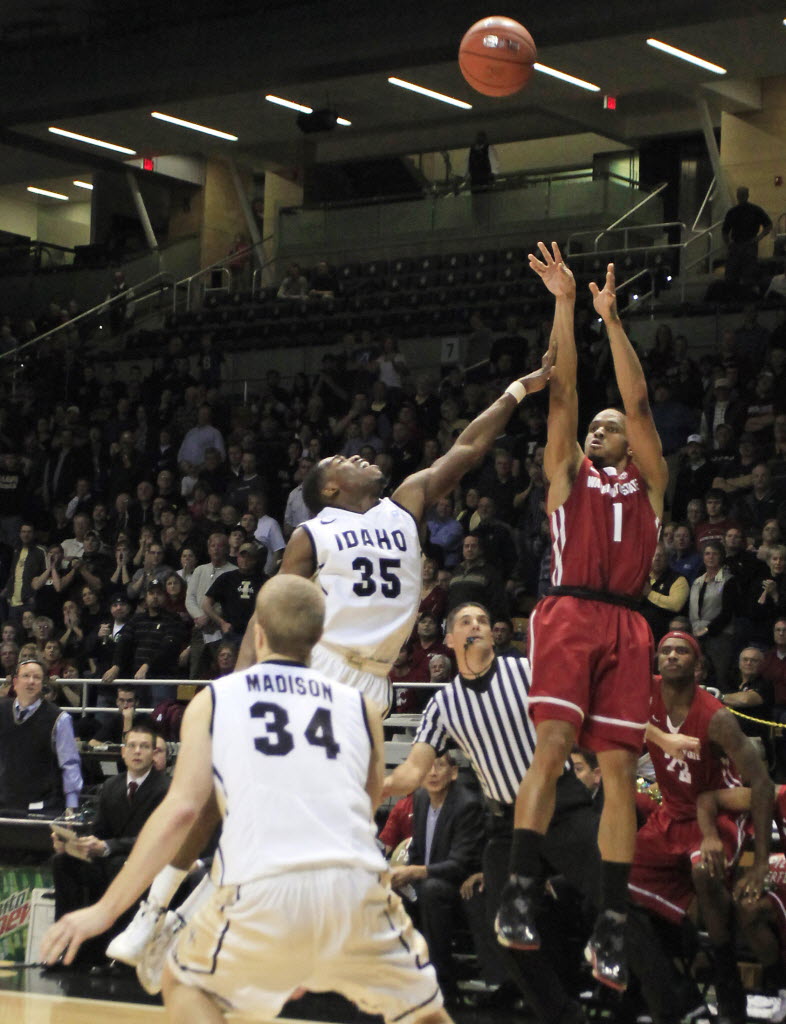 Washington State guard Reggie Moore (1) hits this game winning shot with 0.9 seconds left over Idaho guard Deremy Geiger (35) as Stephen Madison (34) watches during an NCAA college basketball game Wednesday in Moscow. Moore lead Washington State 15 points at they won 66-64. (AP Photo/Moscow-Pullman Daily News, Dean Hare)