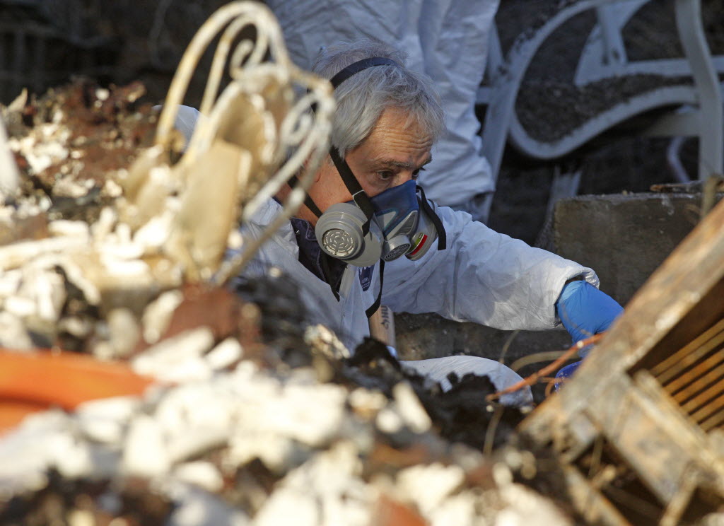 An investigator searches through rubble Thursday in Washougal, Wash. Authorities searched the rubble of a house fire Thursday before finding two bodies including that of a former Bonner County supremacist Steven D. Stanbary, who fired multiple rounds from rifles and handguns for at least 90 minutes Wednesday while the home burned around him. Today, it has been learned that Stanbary was being investigated for possible child molestation crimes. See below. (AP Photo/Rick Bowmer, Pool)