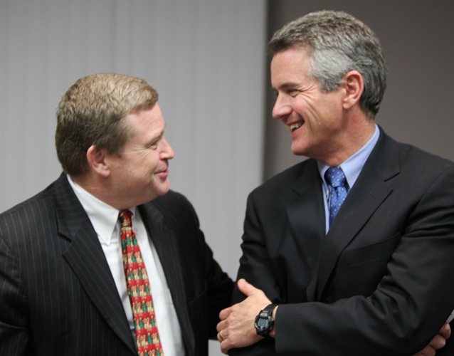 Attorney General Lawrence Wasden and Kootenai County Prosecutor Barry McHugh, who graduated from the University of Idaho Law School together in 1985, exchange pleasantries before the meeting Tuesday in the Spokesman-Review building in Coeur d’Alene.