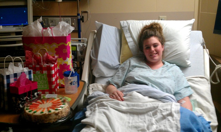 Jessica White, victim of a hit-and-run accident in downtown Coeur d’Alene b/n 2-3 p.m. Sunday, is shown at Kootenai Medical Center, prior to her release. Jessica is the granddaughter of retired, long-time SR/CdA employee Jeanne Helstrom. Jessica’s mother, Kris, tells HucksOnline that Jessica suffered “three fractured vertabrae, lots of road rash and bruising, a nice gash in her side.” Also, Monday was Jessica’s 22nd birthday.