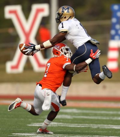 Montana State’s Elvis Akpla (1) makes a leaping reception over Sam Houston State’s Daxton Swanson during the first half of an NCAA college football game Saturday at Bowers Stadium in Huntsville, Texas. The catch was aired in coverage by ESPN and received national attention. Story here. (AP Photo/Houston Chronicle, Eric Christian Smith)