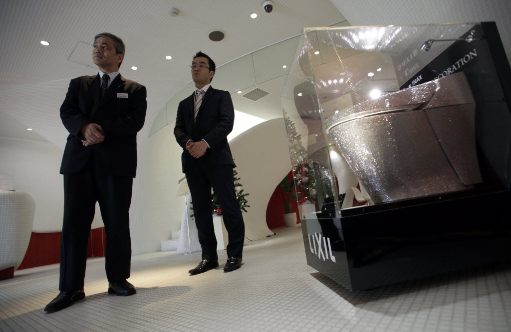Kazuo Sumimiya, left, manager of a showroom of Lixil, the firm that owns Japan’s toilet maker Inax, and Lixil PR person Shintaro Kaai stand near a toilet decorated with 72,000 pieces of crystal from Swarovski AG of Austria at the showroom in Tokyo earlier today. The toilet, valued at 10 million yen (US$128,000) by Lixil although it is not for sale, is on display until Dec. 28. (AP Photo/Junji Kurokawa)
