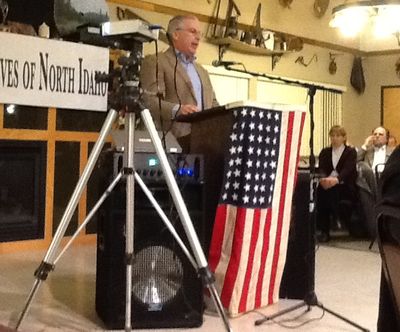 I’m switching out the photo of Region 1 GOP chief John Cross at the podium during the organizational meeting of Bob Pedersen’s rebranded United Conservatives of North Idaho for one of Rep. Phil Hart. The Hart photo shows the bottom of the flag better. Digger spotted something terribly wrong with this photo. Seems that the U.S. flag may be dragging on the ground. Or is it the camera angle? Would any self-respecting North Idaho conservative be caught dead at a meeting where the flag was allowed to drag on the ground?
