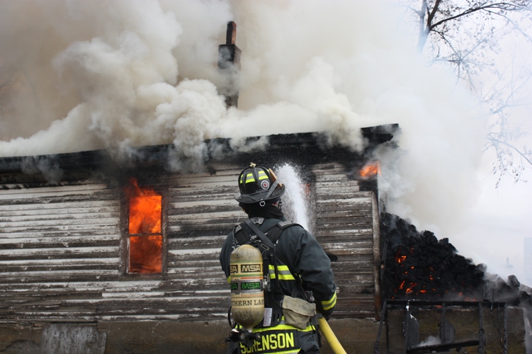 Northern Lakes Fire District fireman Erin Sorenson fights to extinguish flames and to protect outbuildings this afternoon after being called at about 12:35 to a fully engulfed house fire at 3427 Scarcello Road/Rathdrum. According to a fire district news release, firefighters found the house fully involved with the homeowner outside the home with no other occupants. The adult male homeowner was later transported to Kootenai Health. No more information on his condition is available. Story here. (Northern Lakes photo)