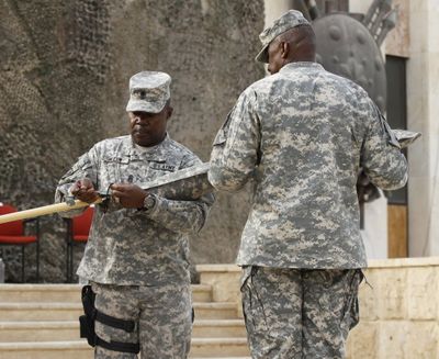 Command Sgt. Major Joseph R. Allen, left, and Army Gen. Lloyd Austin, Commander of US Forces Iraq, encase the US Forces Iraq colors during a ceremony in Baghdad, Iraq, earlier today. The ceremonies mark the official end of the US military mission in Iraq. (AP Photo/Pablo Martinez Monsivais, Pool)