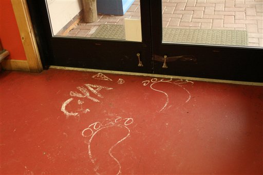 In this Feb. 11, 2010 file photo provided by the Islands’ Sounder newspaper, chalk drawings of bare feet are shown on the floor of the Homegrown Market on Orcas Island, Wash., after Colton Harris-Moore broke in overnight. (AP Photo/Courtesy Islands’ Sounder, Meredith Griffith, File)