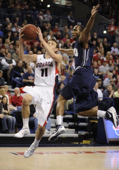 Gonzaga guard David Stockton (11) heads to the basket as Oral Robert’s guard Roderick Pearson Jr. tries to block during the second half of their NCAA college basketball game Thursday in the McCarthey Athletic Center in Spokane. Jim Meehan/SR story of Zags 67-61 win here. And: more SR game photos here. (AP Photo/Spokesman-Review, Colin Mulvany)