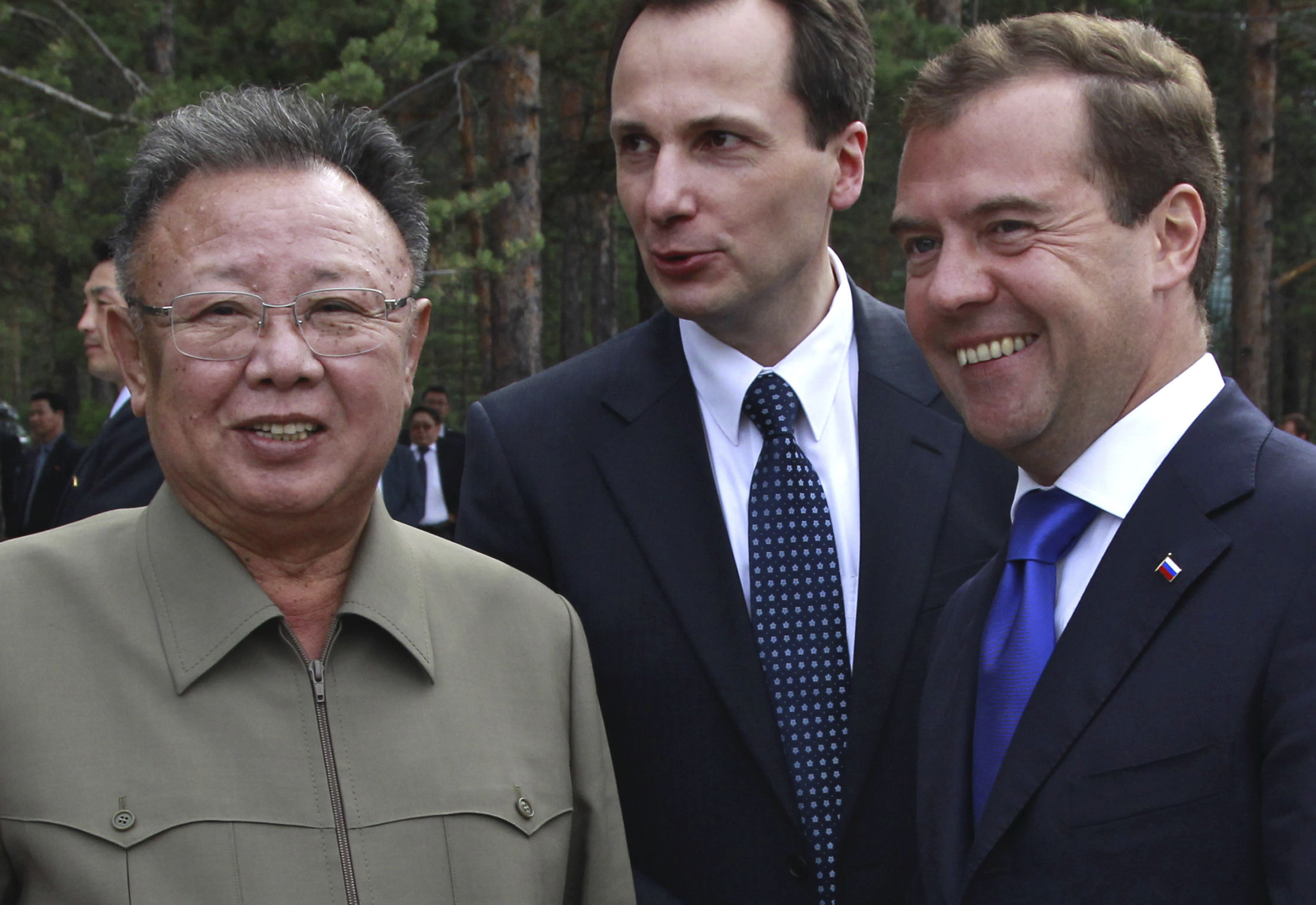 Aug. 24, 2011: Kim listens to Russian President Dmitry Medvedev, right, during a summit meeting at a military garrison in eastern Siberia.