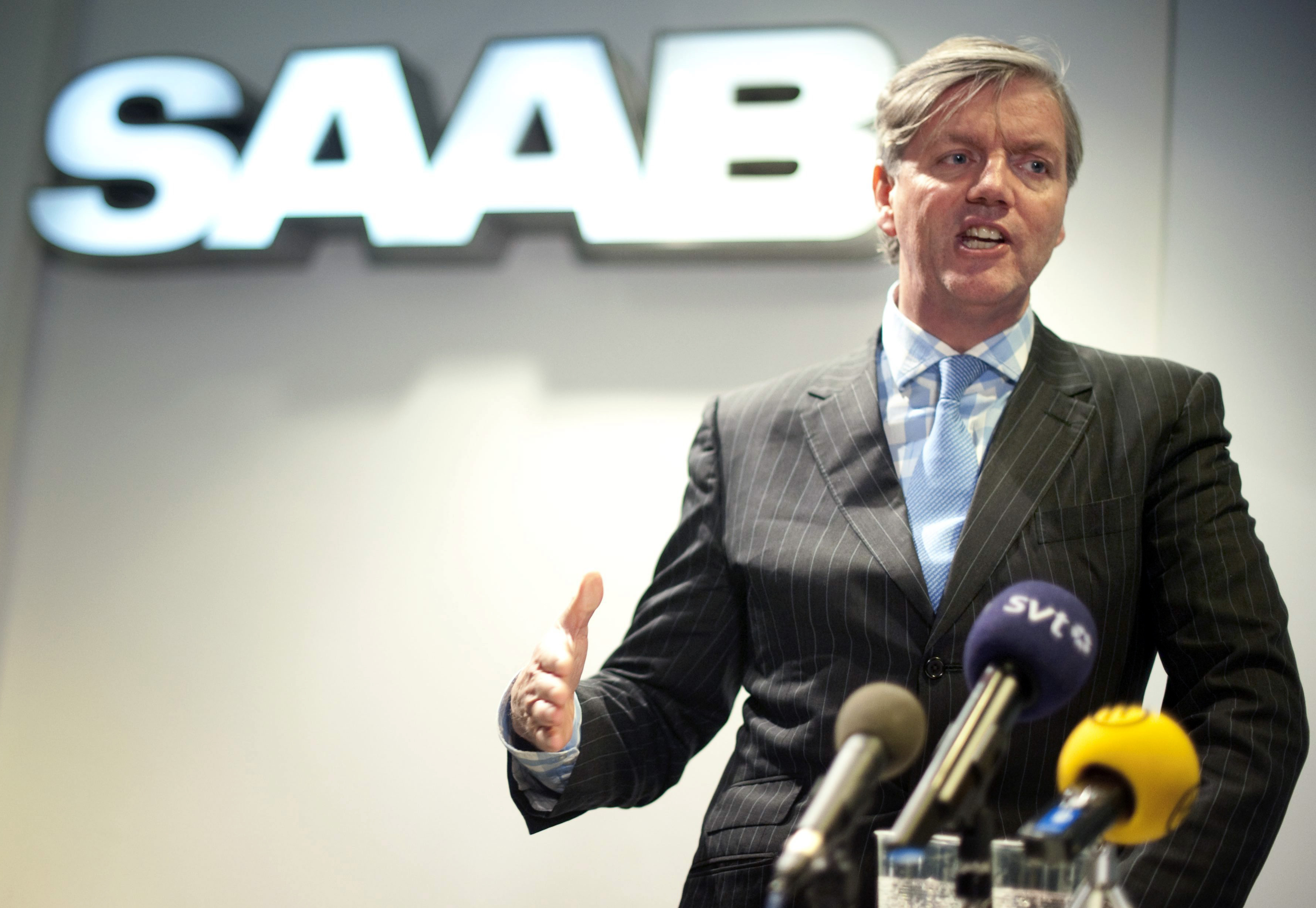Saab Automobile President and Chairman Victor Muller speaks to media Monday in Trollhattan, Sweden, after the company filed for bankruptcy.