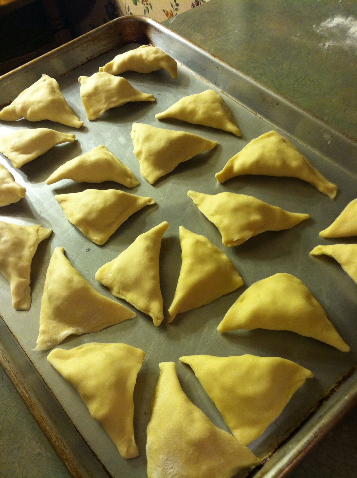 Roll out dough thin and cut in 2-inch squares. Place spoonful of filling and fold in triangle. pinch edges tightly to seal well. Drop in boiling water and boil gently until done. (10-15 minutes)