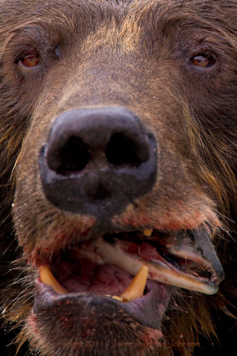 At left, Johnson captured a closeup of a grizzly getting a full deal from its meal. Perhaps the head of a salmon offers a satisfying crunch to a grizzly’s dining experience, much like a crouton on a salad.