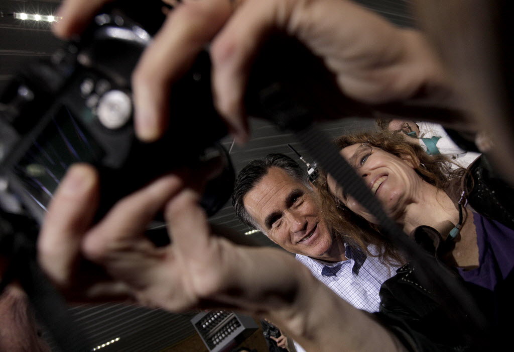Republican presidential candidate, former Massachusetts Gov. Mitt Romney has his picture taken with Amy Bleyle, of Ames, Iowa, during a campaign stop at Kinzler Construction in Ames, Iowa, earlier today. (AP Photo/Charlie Riedel)