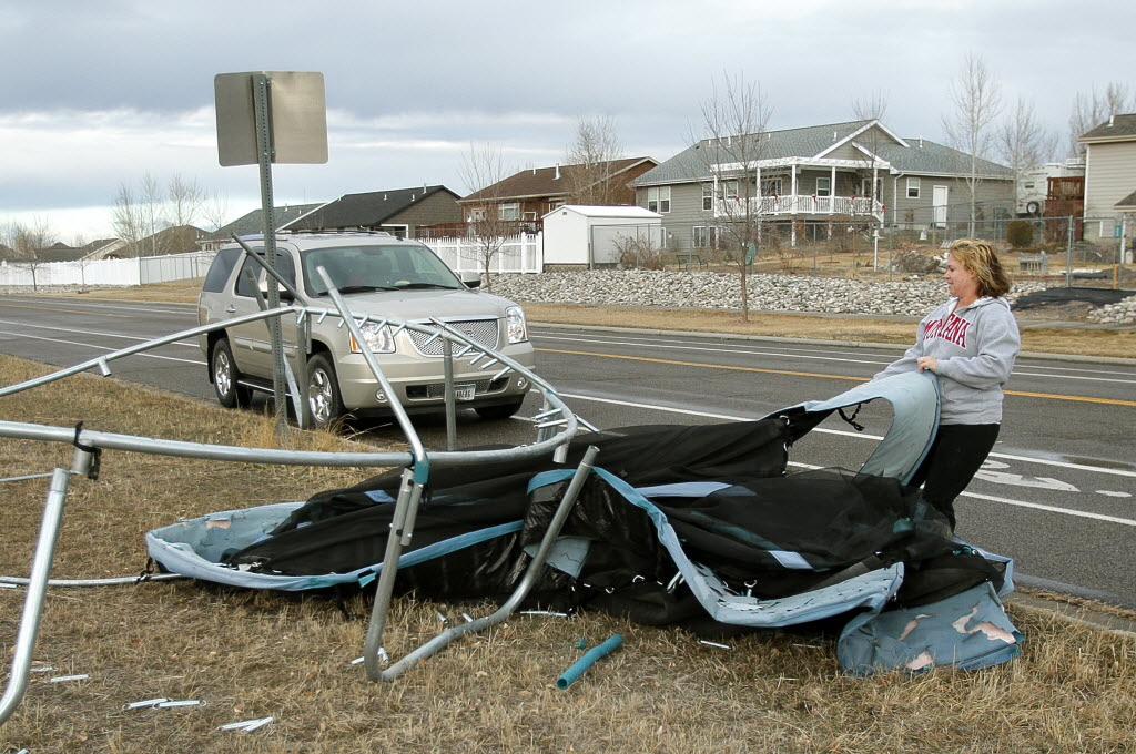 Valerie Wanberg dismantles a family trampoline after a wind storm carried it 100 yards down Briarwood Blvd, in Billings, Mont., on Thursday. (AP Photo/The Billings Gazette, Bob Zellar)