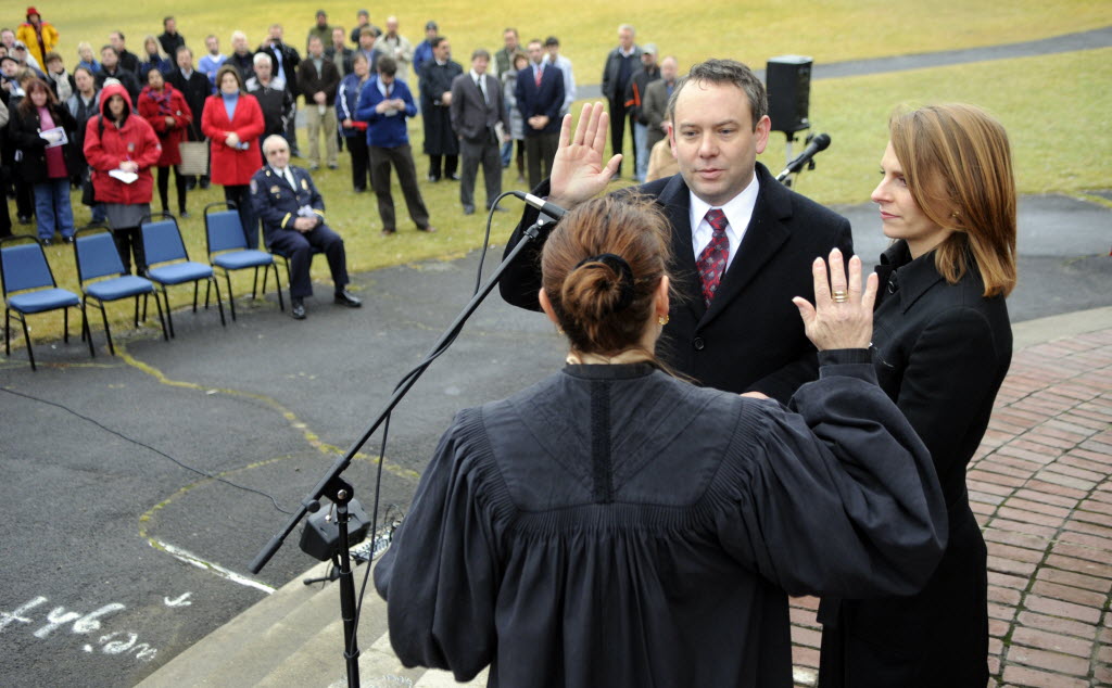 In the shadow of the Riverfront Park Clock Tower , David Condon is sworn in as the Spokane’s 44th mayor by Judge Mary Logan this afternoon. Condon’s wife, Kristin, right, holds the bible for the Oath of Office ceremony. Story here. (SR photo: Dan Pelle)