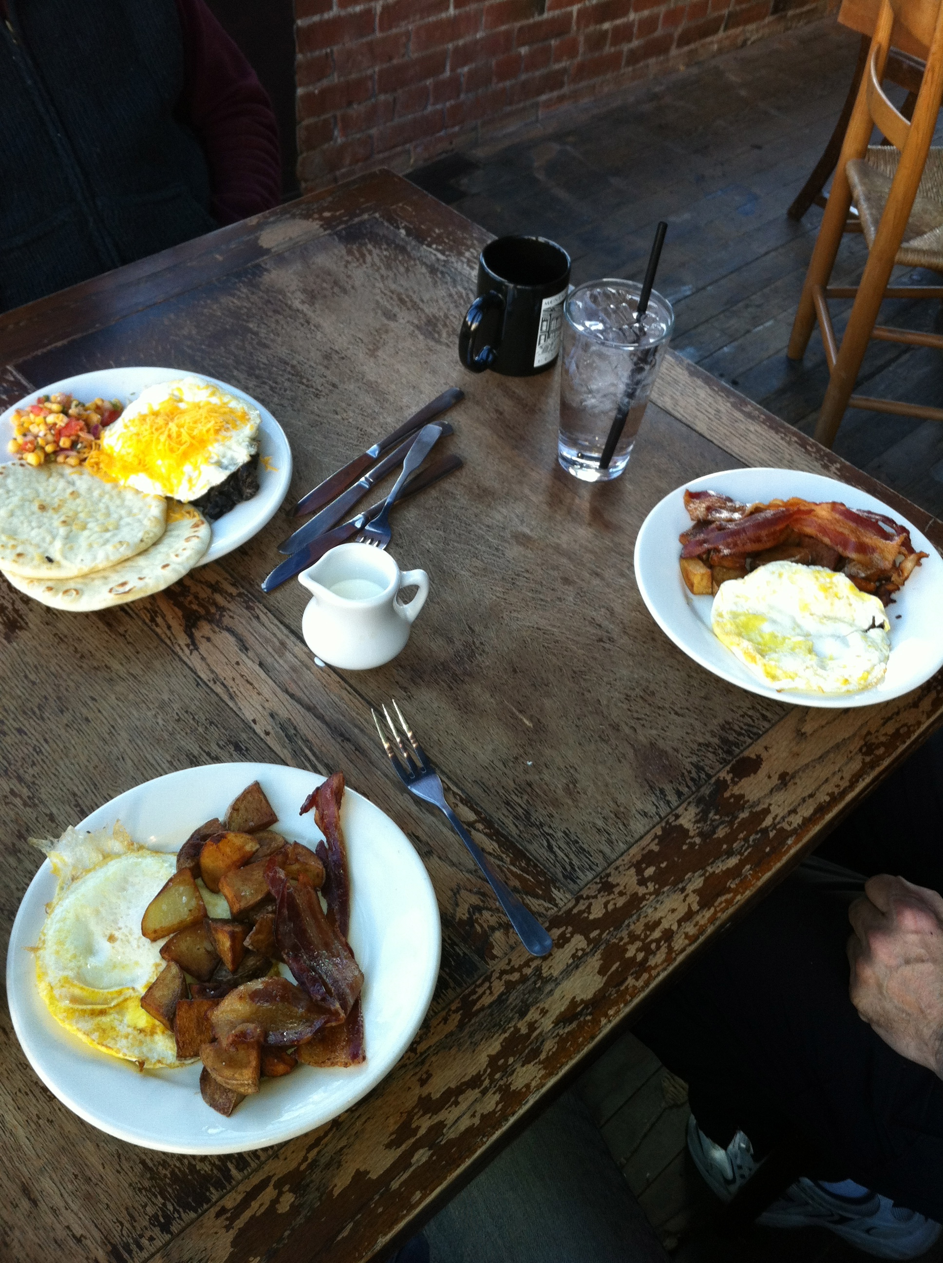 So, OK, let’s just say that from what I saw this morning, Scout as a Saturday-morning breakfast spot is still showing growing pains. For one thing, nice as she was, our server was clearly over her head. And though there were only about four tables to work, even that seemed too much. We got our coffees, and the blend was at least drinkable, but no warm-up came until just before we were ready to leave. Our food came quickly enough, though we never could find ketchup for our home fries. And my friend Pat never did get the order of toast he’d ordered.