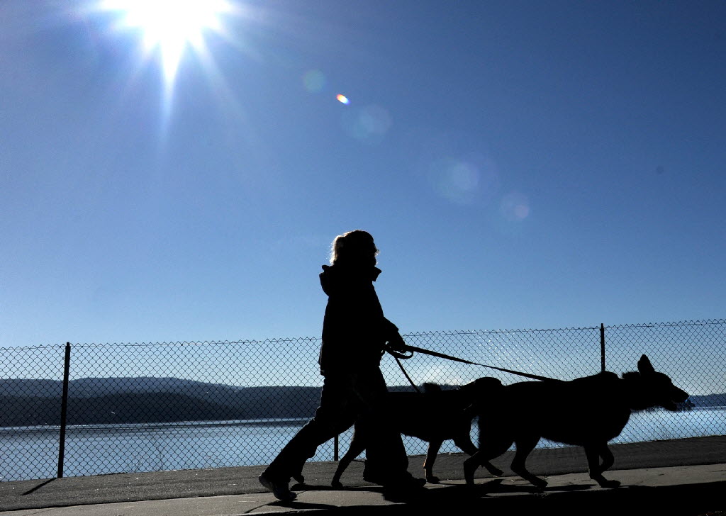 The sun was deceiving as Amidy Fuson walked her dogs in 17-degree weather along Centennial Trail in Coeur d’Alene today. (SR photo: Kathy Plonka)