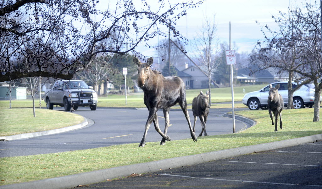 Nah, this isn’t the moose and calf that was hanging out in the Northshire subdivision, just north of that Atlas Road industrial park. Pursued by Department of Fish and Wildlife and local law enforcement vehicles, a mother moose and two calves run along the street in Walla Walla, Wash. earlier today (AP Photo/Walla Walla Union-Bulletin, Matthew B. Zimmerman)