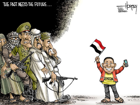 David Horsey has painted a picture of the possible new face of Egypt now that Hosni Mubarak has stepped down. However his imagery of democracy in Egypt leaves a fair amount, I believe. While events of the last 18 days in Egypt qualify as a peaceful revolution in one sense of the word, I also believe it is a military coup and as such, is not a true democracy at all, for Mubarak was nearly a lifelong member of Egypt’s military, and who do we now have in charge of Egypt? The military is in charge of Egypt.