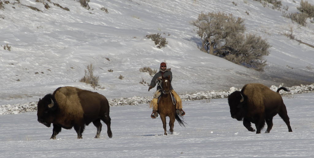 A government horseback rider hazes bison to move them from one location to another earlier today, just inside Yellowstone National Park near Gardiner, Mont. U.S. District Judge Charles Lovell in Helena issued a ruling this morning in which he denied a request from wildlife advocates to stop the slaughter of potentially hundreds of wild bison from Yellowstone National Park that had attempted to migrate into Montana. Story below. (AP Photo/Ted S. Warren)