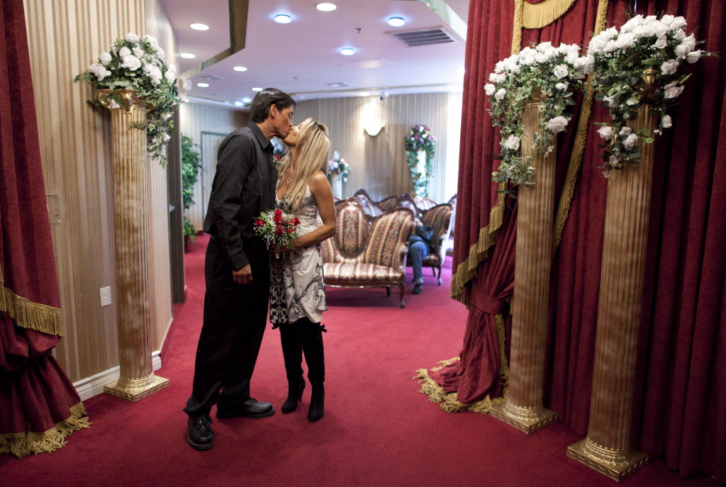 Christopher Pruett, left, and Cindy Zuniga of Honolulu, Hawaii, kiss after being pronounced man and wife at the Little White Weddning Chapel earlier today in Las Vegas. (AP photo: Julie Jacobson)