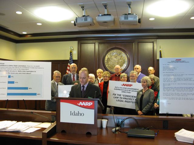 There are now three bills seeking to amend Idaho’s “conscience law” to protect patients’ living wills and advance care directives as they’re dying, and one House committee chairman has buried all three in his desk drawer and refused to hold hearings on them, the AARP of Idaho, legislative sponsors of the bills and a group of Idaho seniors announced at a Statehouse press conference today.