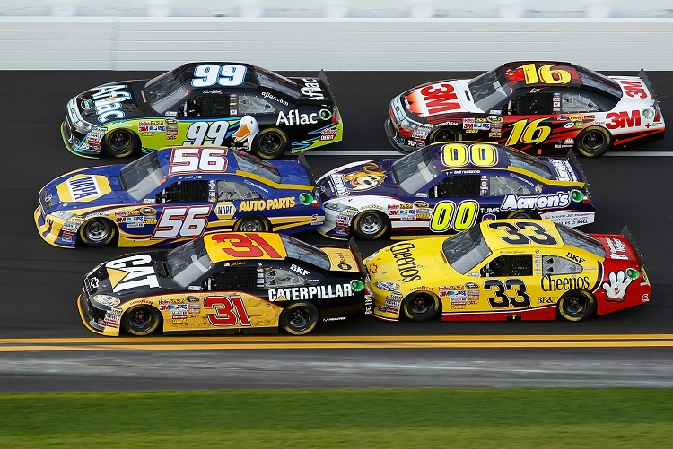 Three wide racing as Carl Edwards, Greg Biffle, Martin Truex Jr., David Reutimann, Jeff Burton and Clint Bowyer draft during the Gatorade Duel at Daytona International Speedway in Daytona Beach, Fla.  (Photo Credit: Todd Warshaw/Getty Images for NASCAR) (Todd Warshaw / Getty Images North America)