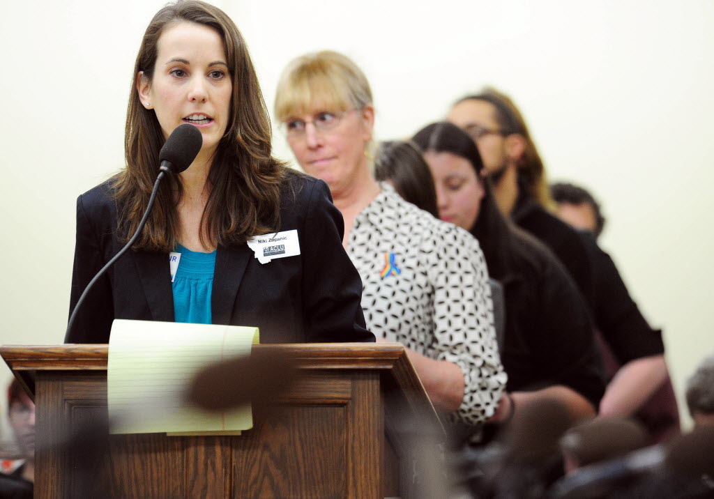 Niki Zupanic, public policy director for ACLU Montana, speaks on behalf of HB514 in front of the House Judiciary Committee in the Montana state capitol building earlier today in Helena, Mont. Gay rights advocates want the Legislature to expand discrimination protection statewide _ while conservative religious groups want the lawmakers to repeal Missoula’s local ordinance establishing extra protections for gays and others. Story here. (AP Photo/The Independent Record, Eliza Wiley)