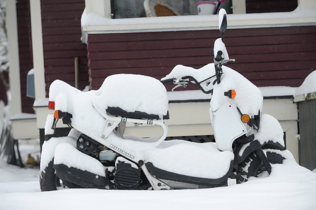 A form of summer transportation is covered winter snowfall in Coeur d’Alene Thursday after a 24-hour snowfall total of about a foot in the city by the lake. (SR photo: Jesse Tinsley)