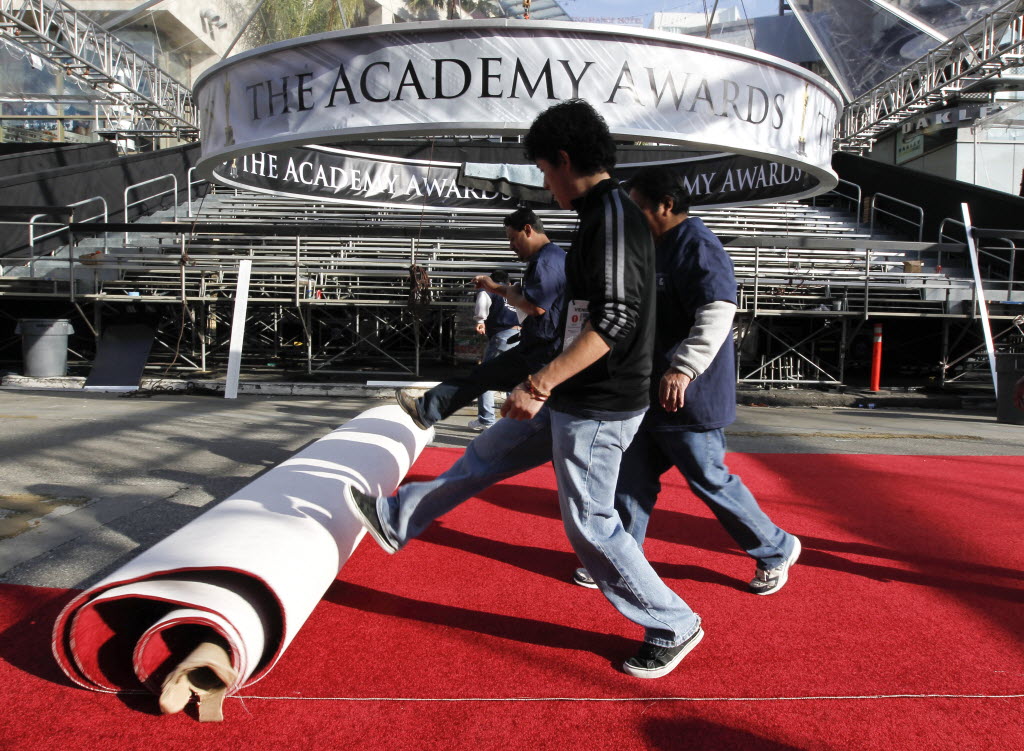 Workers from American Turf and Carpet roll out the red carpet at the Kadak Theatre in Los Angeles, Wednesday. James Franco and Anne Hathaway will host the 83rd annual Academy Awards Sunday. Story here . (AP Photo/Chris Carlson)