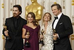 (AP photo: Christian Bale, left, best supporting actor, Natalie Portman, best actress, second from left, Melissa Leo, second from right, best supporting actress, and Colin Firth, best actor.)
