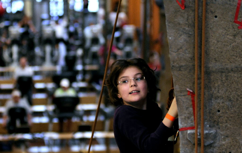 Elizabeth Miller, 9, checks out the view near the top of the climbing wall at the Salvation Army Kroc Center recently. She participated in the Holiday School’s Out Day Camp at the center in Coeur d’Alene. (SR photo: Kathy Plonka)