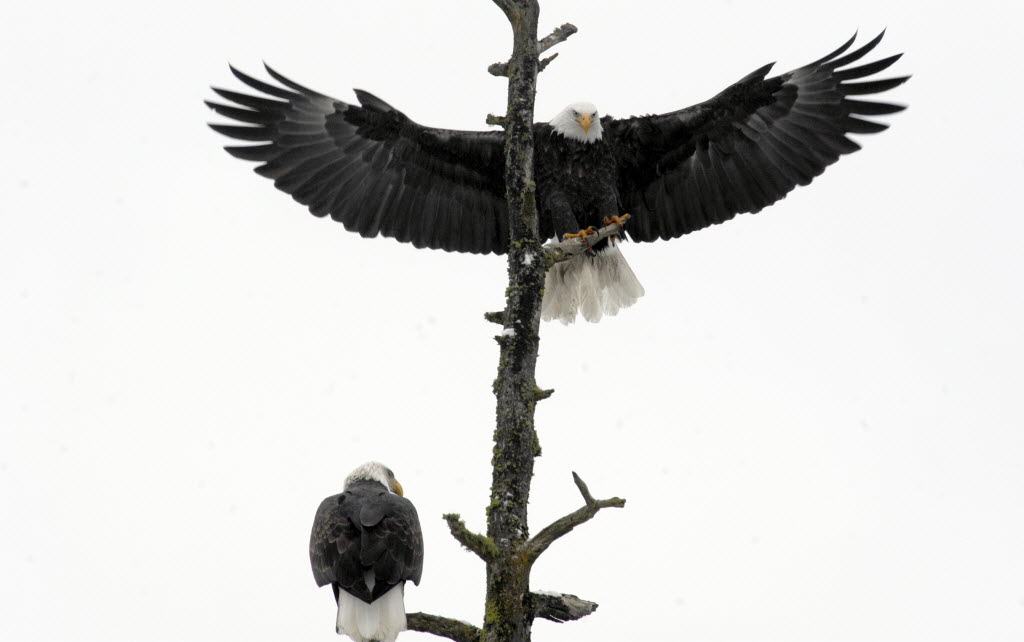 A bald eagle lands near another in a tree above Lake Coeur d’Alene, to wait for a catch of kokanee on Tuesday in Coeur d’Alene. The birds will soon move on from the winter feeding stop in North Idaho. You can view 7 more wonderful eagle photos by Jesse here . (AP Photo/The Spokesman-Review, Jesse Tinsley)