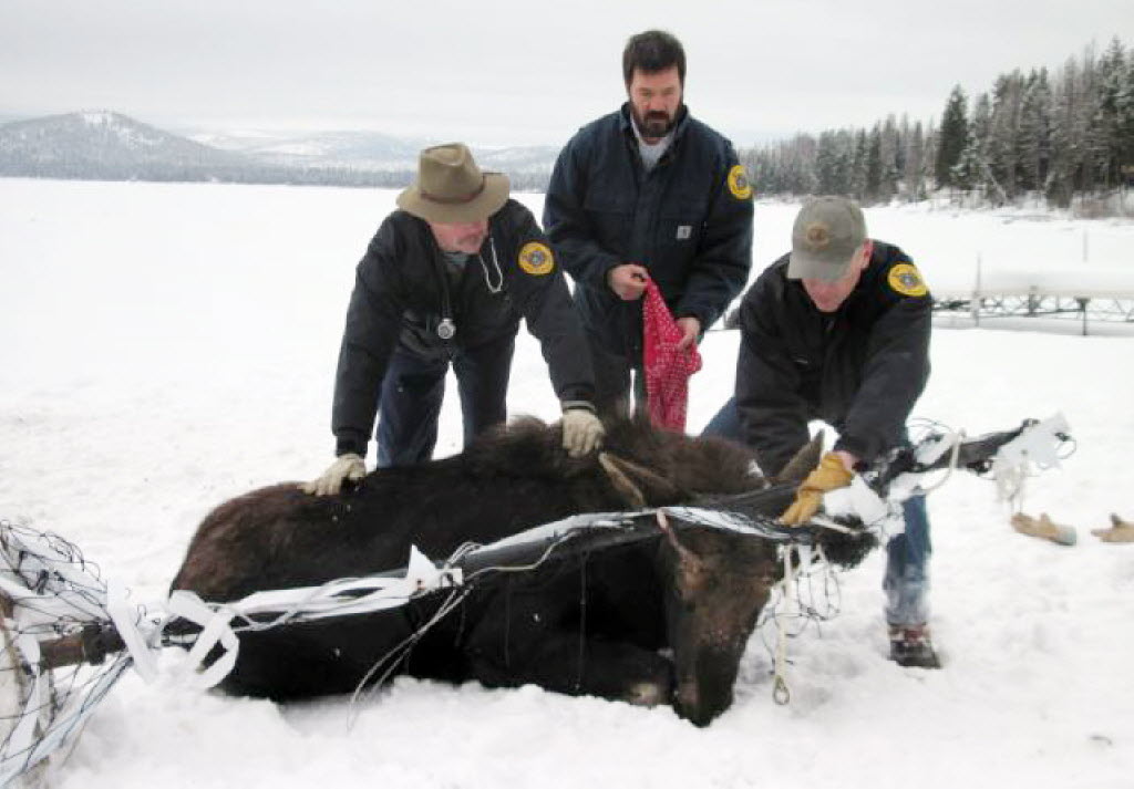 Montana wildlife biologists, left to right, Erik Wenum, Kent Laudon, and John Vore cut away netting from a young bull moose that became tangled in a volley ball net along the shore of Bitterroot Lake in northwestern Montana. Agency biologists found the net wrapped around its small antlers. They tranquilized the moose and cut the material from the antlers. (AP Photo/Montana Fish, Wildlife and Parks)