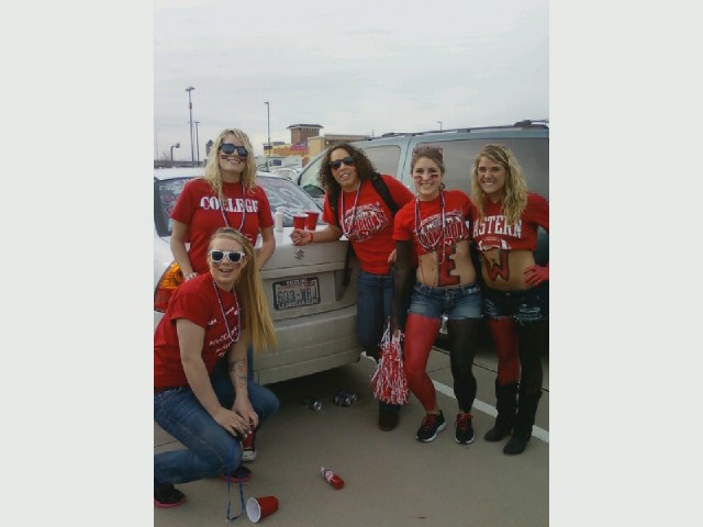Eastern Washington students Haley Tank, Cassandra Herdrick and Taylor Walker join friends at an EWU tailgate party after arriving in Frisco at 2 a.m. on Friday — a full 30 hours after leaving Cheney.
