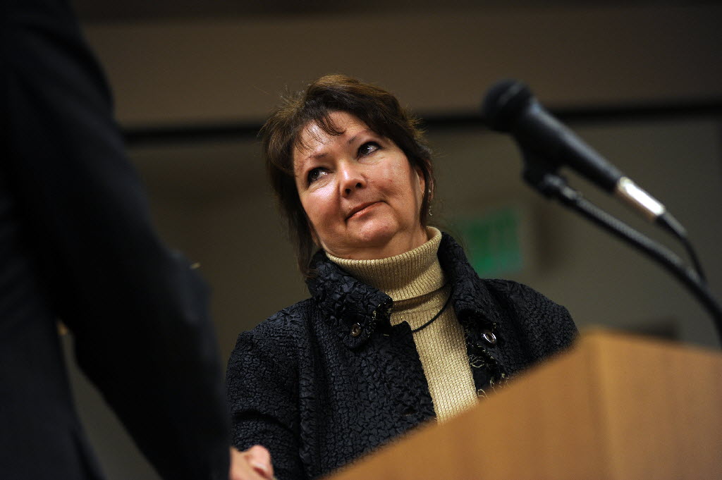 Kootenai County coroner Debby Willkey was sworn in at the Kootenai County administration building this morning. Wilkey drew a laugh from the crowd when she said: “It’s never really good to say as a coroner, ‘I’m looking forward to meeting all of you…’ ” (SR photo: Kathy Plonka)