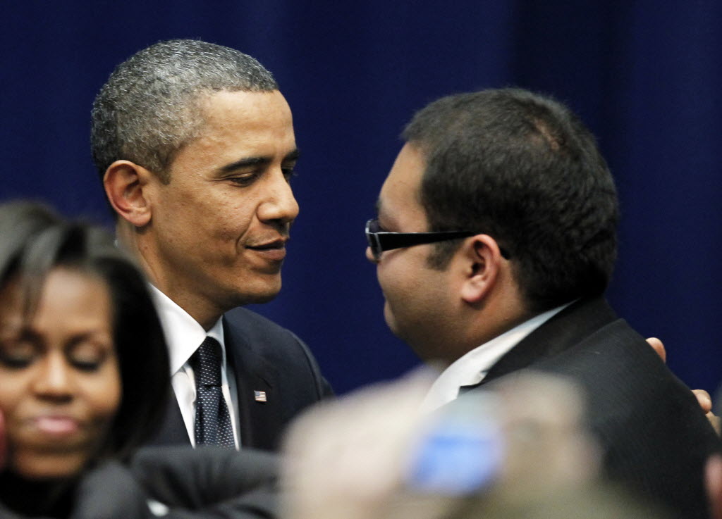 President Barack Obama hugs Daniel Hernandez, an intern for Rep. Gabrielle Giffords at a memorial service for the victims of Saturday’s shootings at McKale Center on the University of Arizona campus Wednesday in Tucson, Ariz. Hernandez tended to the congresswoman after she’d been shot. (AP Photo/Chris Carlson)