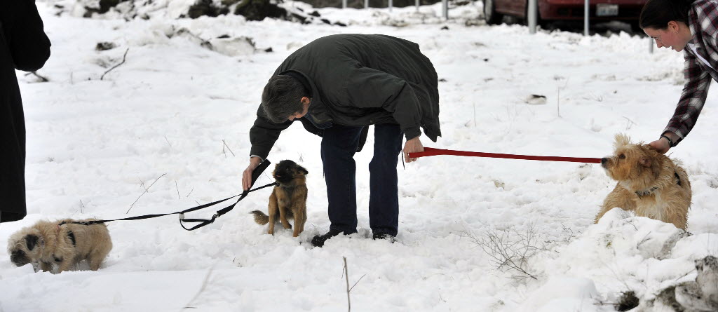 Carolyn Fielder, of Spokane, has her hands full with her dogs, Lily Mae, Kadin and Claire, as they attend the opening of the SpokAnimal’s Dog Park at High Bridge on Thursday in Spokane. Kat Storwick, at right, lends a helping hand. (SR photo: Dan Pelle)