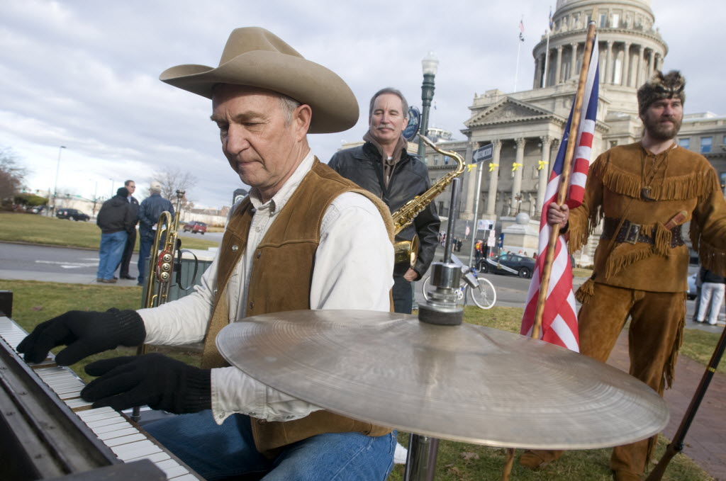 John Hoff, of Weiser, plays the piano on the grass of Capitol Park before the start of the Idaho Tea Party Converge on the Capitol event the Statehouse in Boise on Monday. Pictured in the background is Boise saxophone player David Westmoreland and Marc Schneider, of Boise, who dressed as Davy Crockett for the event. The rally cast scorn at Washington and health care reform.