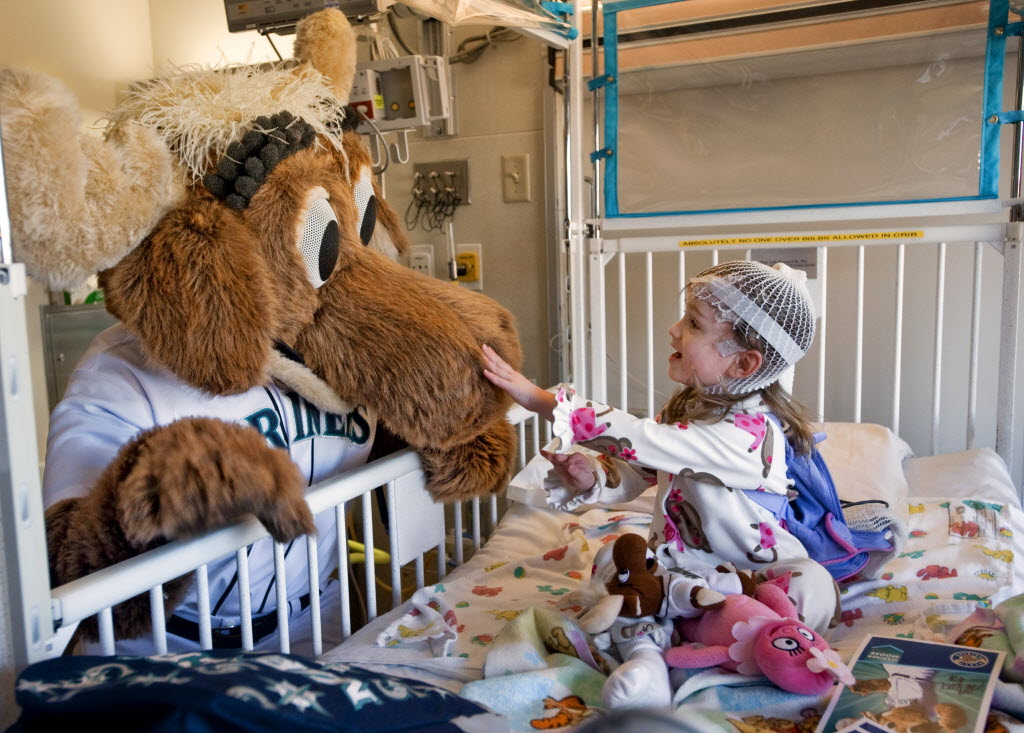 Three-year-old Sarah Spudlich of Bemerton, Wash., touches the fur of the Mariner Moose during a visit to Mary Bridge Children’s Hospital in Tacoma, Wash., today. In addition to Moose, players Doug Fisher and Josh Wilson as well as broadcaster Dave Sims went room-to-room giving autographs and Mariners backpacks to young patients. (AP Photo/The News Tribune, Peter Haley)