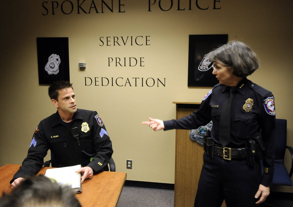 In a press conference today, Spokane Police Chief Anne Kirkpatrick credits two officers, including Eric Olson, left, with making a decision to steer the MLK Jr. parade away from what was determined to be an explosive device in downtown Spokane. Story here . (SR photo: Dan Pelle)