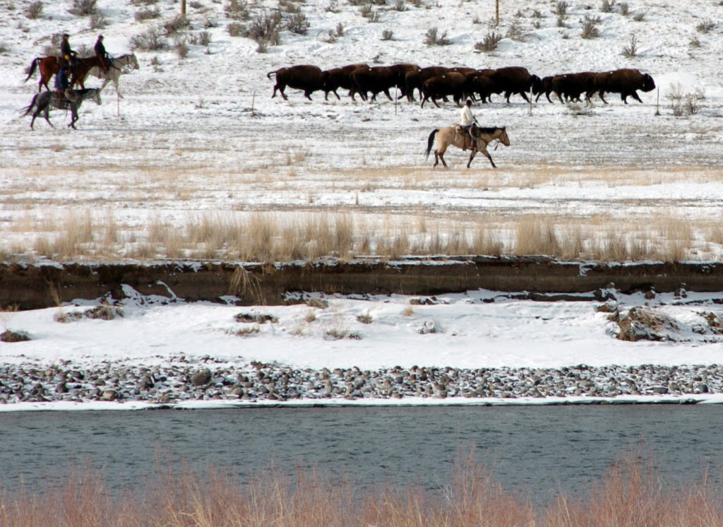 Bison from Yellowstone National Park are herded down the Yellowstone River valley toward Cutler Meadow in the Gallatin National Forest in Montana last week. The bison are the first in more than a century to be allowed into the area north of the park, rather than being captured and slaughtered in the name of disease prevention. (AP Photo/Matthew Brown)