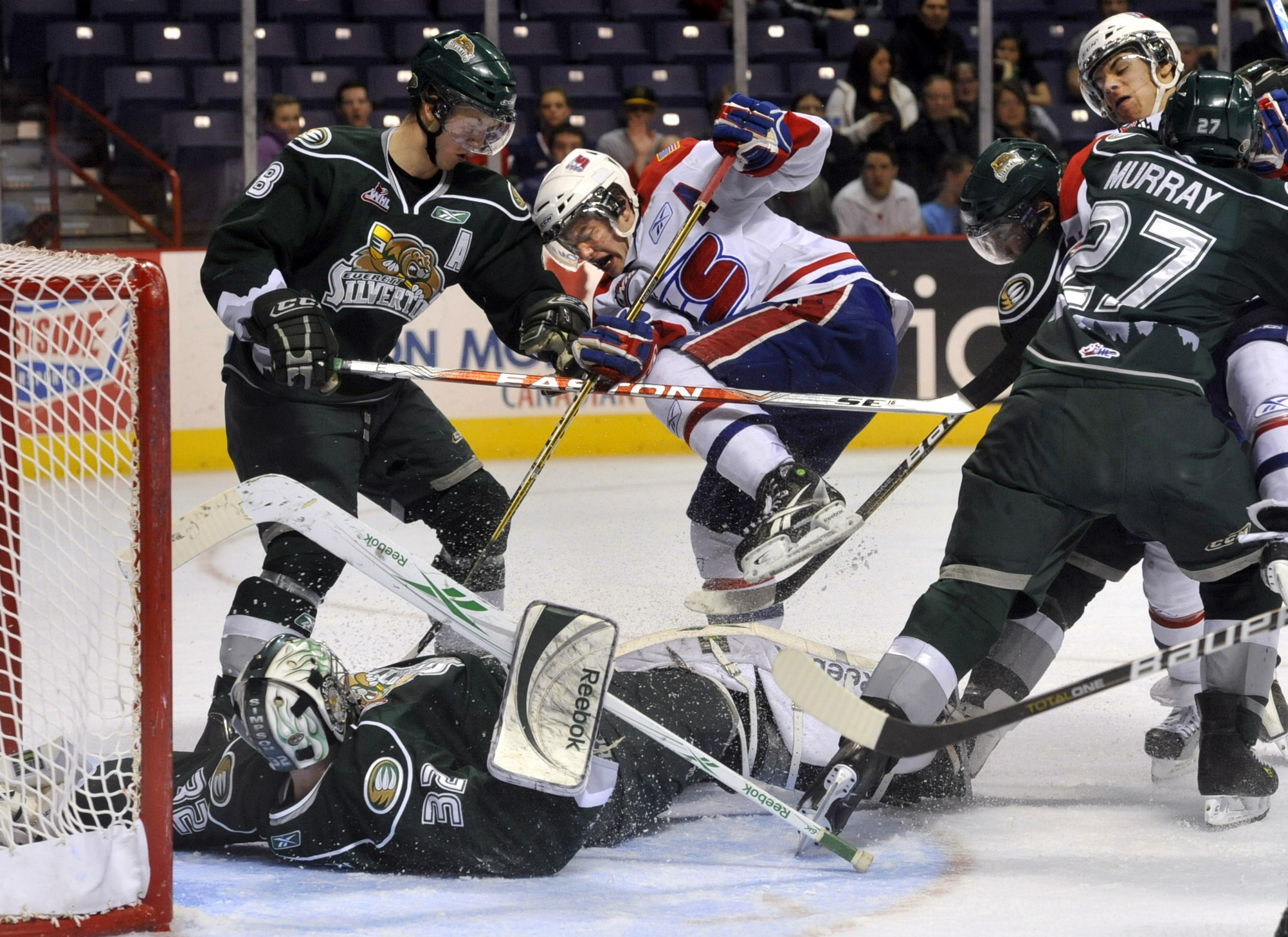 In photo above, Chiefs Steven Kuhn and Brady Brassart (right) battle Everett defenders Rasmus Rissanen (8) and Ryan Murray (27) along with goalie Kent Simpson.