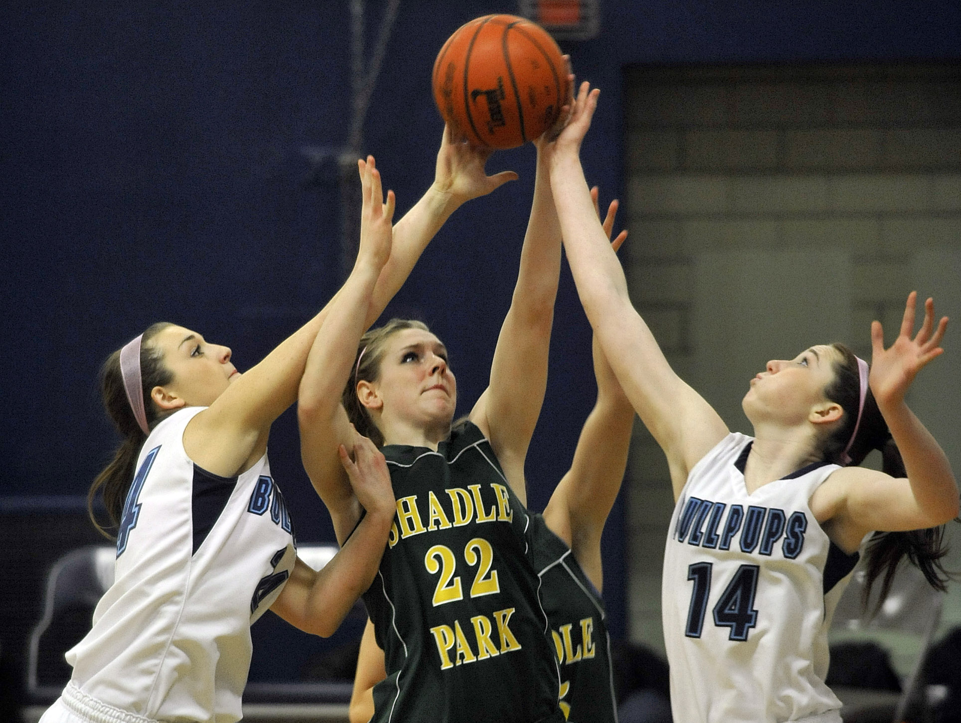 Pictured above is Shadle Park’s Kaycee Hert battling for a rebound with Gonzaga Prep’s Megan Steilen and Madison Wright .