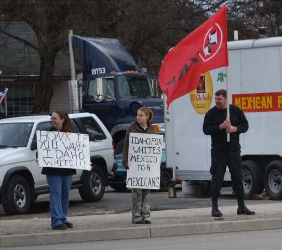Stebbijo @ Stebbijo’s Place offers another photo of the neo-Nazi picketers at Chiludo’s Mexican Food (about 3000 block of Government Way, north of Les Schwab’s Tires). You can also find a photo of a decent line of customers frequenting the Mexican stand on Stebbijo’s site here.